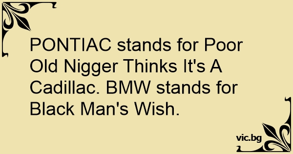 PONTIAC stands for Poor Old Niggеr Thinks It's A Cadillac. BMW stands for Black Man's Wish.