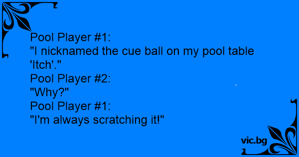 Pool Player #1:<br />"I nicknamed the cue ball on my pool table 'Itch'."<br />Pool Player #2:<br />"Why?"<br />Pool Player #1:<br />"I'm always scratching it!"