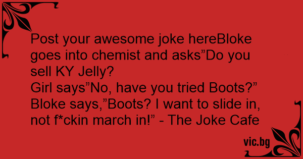 Post your awesome joke hereBloke goes into chemist and asks”Do you sell KY Jelly?