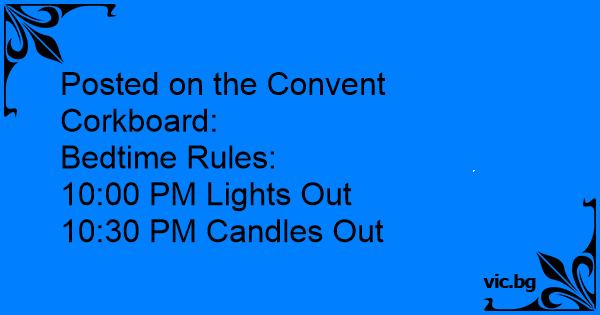 Posted on the Convent Corkboard:<br />Bedtime Rules:<br />10:00 PM Lights Out<br />10:30 PM Candles Out