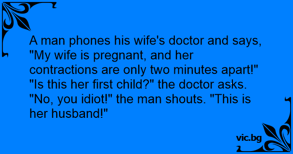 Un homme, affolé, s'écrie au téléphone : - Docteur, docteur, ma femme est enceinte et a des contractions toutes les deux minutes ! - C'est son premier enfant ? - Non, non, c'est son mari.
