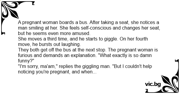 They both get off the bus at the next stop. The pregnant woman is furious and demands an explanation. "What exactly is so dамn funny?"