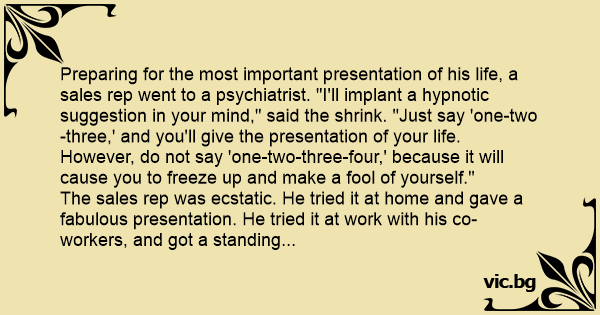 Preparing for the most important presentation of his life, a sales rep went to a psychiatrist. "I'll implant a hypnotic suggestion in your mind," said the shrink. "Just say 'one-two-three,' and you'll give the presentation of your life. However, do not say 'one-two-three-four,' because it will cause you to freeze up and make a fool of yourself."