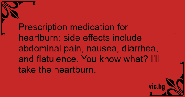 Prescription medication for heartburn: side effects include abdominal pain, nausea, diarrhea, and flatulence. You know what? I'll take the heartburn.