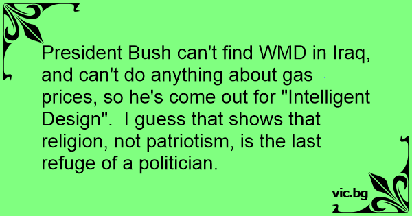 President Bush can't find WMD in Iraq, and can't do anything about gas prices, so he's come out for "Intelligent Design". I guess that shows that religion, not patriotism, is the last refuge of a politician.