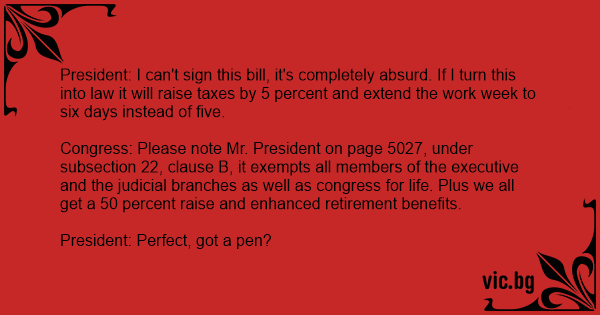 President: I can't sign this bill, it's completely absurd. If I turn this into law it will raise taxes by 5 percent and extend the work week to six days instead of five.
