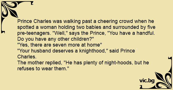 Prince Charles was walking past a cheering crowd when he spotted a woman holding two babies and surrounded by five pre-teenagers. "Well," says the Prince, "You have a handful. Do you have any other children?"