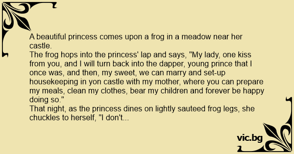 The frog hops into the princess' lap and says, "My lady, one kiss from you, and I will turn back into the dapper, young prince that I once was, and then, my sweet, we can marry and set-up housekeeping in yon castle with my mother, where you can prepare my meals, clean my clothes, bear my children and forever be happy doing so."
