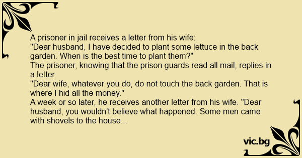 The prisoner, knowing that the prison guards read all mail, replies in a letter: