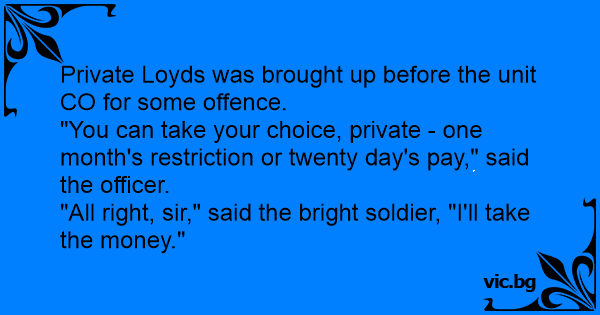 "You can take your choice, private - one month's restriction or twenty day's pay," said the officer.