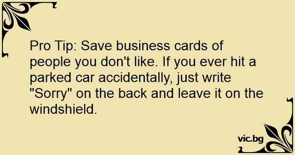Pro Tip: Save business cards of people you don't like. If you ever hit a parked car accidentally, just write "Sorry" on the back and leave it on the windshield.