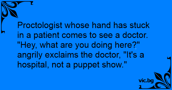 "Hey, what are you doing here?" angrily exclaims the doctor, "It's a hospital, not a puppet show."