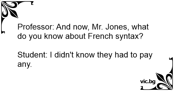 Professor: And now, Mr. Jones, what do you know about French syntax?