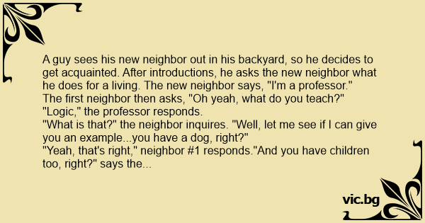 "Yeah, that's right," neighbor #1 responds."And you have children too, right?" says the professor."Wow, right again!" exclaims the neighbor."So, then you must be married and that would make you a heterosexual, right?'' proclaims the professor."Unbelievable, you're absolutely correct. How do you know all this about me?"