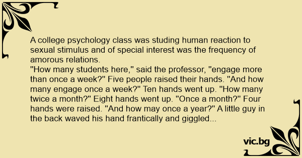 ''How many students here,'' said the professor, ''engage more than once a week?'' Five people raised their hands. ''And how many engage once a week?'' Ten hands went up. ''How many twice a month?'' Eight hands went up. ''Once a month?'' Four hands were raised. ''And how may once a year?'' A little guy in the back waved his hand frantically and giggled hysterically. ''If you engage only once a year,'' said the professor, ''I don't see what you're so overjoyed about.'' Flush with excitement, the little guy said, ''Yeah, but tonight's the night!''