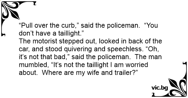The motorist stepped out, looked in back of the car, and stood quivering and speechless. “Oh, it’s not that bad,” said the policeman. The man mumbled, “It’s not the taillight I am worried about. Where are my wife and trailer?”