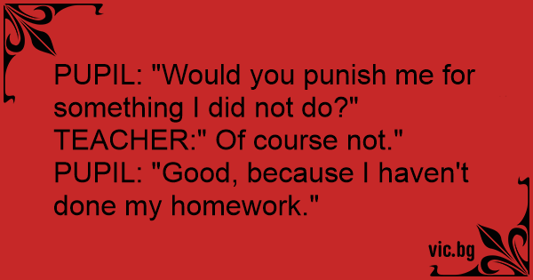 "Kann man für etwas bestraft werden was man gar nicht gemacht hat?", fragt Fritz den Lehrer. Lehrer antwortet: "Nein kann man nicht." Fritz: "Gut, ich hab nämlich meine Hausaufgabe nicht gemacht!"