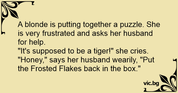 A blonde is putting together a puzzle. She is very frustrated and asks her husband for help.