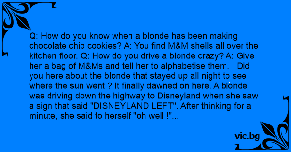 Q: How do you know when a blonde has been making chocolate chip cookies? A: You find M&M shells all over the kitchen floor. Q: How do you drive a blonde crazy? A: Give her a bag of M&Ms and tell her to alphabetise them. Did you here about the blonde that stayed up all night to see where the sun went ? It finally dawned on here. A blonde was driving down the highway to Disneyland when she saw a sign that said "DISNEYLAND LEFT". After thinking for a minute, she said to herself "oh well !" and turned around an drove home. On her way home the same blonde drove past another sign that said "CLEAN RESTROOMS 8 MILES". By the time she drove eight miles, she had cleaned 43 restrooms. How about the suicide blonde, she dyed by her own hand. A brunette and a blonde are walking along in a park. The brunette says suddenly, "Awww, look at the dead birdie". The blonde stops,looks up, and says, "Where?" A policeman pulled a blonde over after he/she'd been driving the wrong way on a one-way street. Cop: Do you know where you were going? Blonde: No, but wherever it is, it must be bad 'cause all the people were leaving.