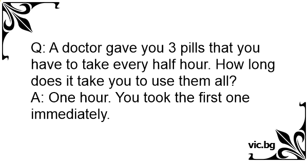 Q: A doctor gave you 3 pills that you have to take every half hour. How long does it take you to use them all?