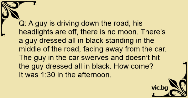 Q: A guy is driving down the road, his headlights are off, there is no moon. There’s a guy dressed all in black standing in the middle of the road, facing away from the car. The guy in the car swerves and doesn’t hit the guy dressed all in black. How come? It was 1:30 in the afternoon.