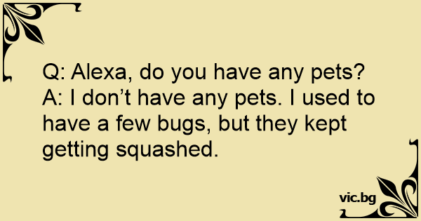 A: I don’t have any pets. I used to have a few bugs, but they kept getting squashed.