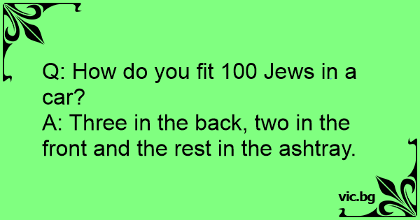 Q: How many jews can you fit in a VW Beetle? A: 54, two in the front, two in the back, and fifty in the ashtray.