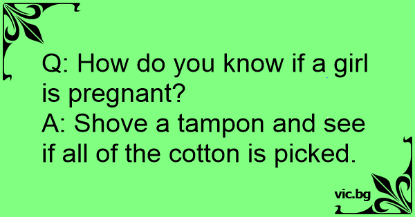 Q: How do you know if a girl is pregnant?<br />A: Shove a тамроn and see if all of the cotton is picked.