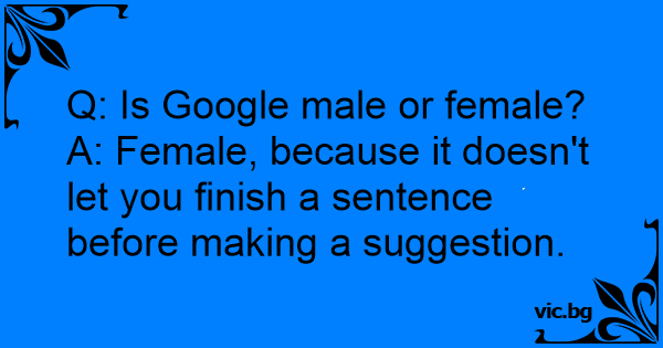 - Τo google είναι θηλυκό ή αρσενικό? - Θηλυκό, επειδή κάνει συστάσεις πριν τελειώσεις την πρόταση σου