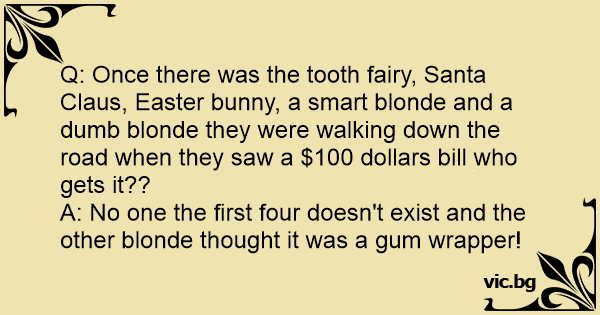 Q: Once there was the tooth fairy, Santa Claus, Easter bunny, a smart blonde and a dumb blonde they were walking down the road when they saw a $100 dollars bill who gets it??