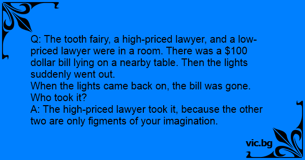 Q: The tooth fairy, a high-priced lawyer, and a low-priced lawyer were in a room. There was a $100 dollar bill lying on a nearby table. Then the lights suddenly went out.