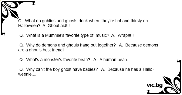 Q. What do goblins and ghosts drink when they're hot and thirsty on Halloween? A. Ghoul-aid!!!