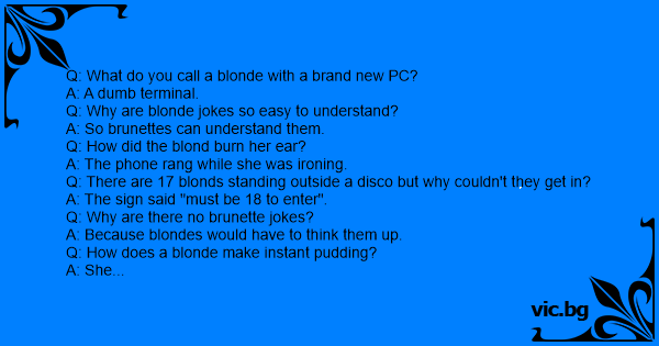 Q: What do you call a blonde with a brand new PC? A: A dumb terminal. Q: Why are blonde jokes so easy to understand? A: So brunettes can understand them. Q: How did the blond burn her ear? A: The phone rang while she was ironing. Q: There are 17 blonds standing outside a disco but why couldn't they get in? A: The sign said "must be 18 to enter". Q: Why are there no brunette jokes? A: Because blondes would have to think them up. Q: How does a blonde make instant pudding? A: She places the box in the microwave and looks for the "instant pudding setting" button. Q: Did you hear about the blonde that went to library and checked out a book called "How to Hug"? A: When she got back to the dorm and found out it was volume seven of the encyclopedia. Q: What do you call 24 blondes in a cardboard box? A: A case of empties.