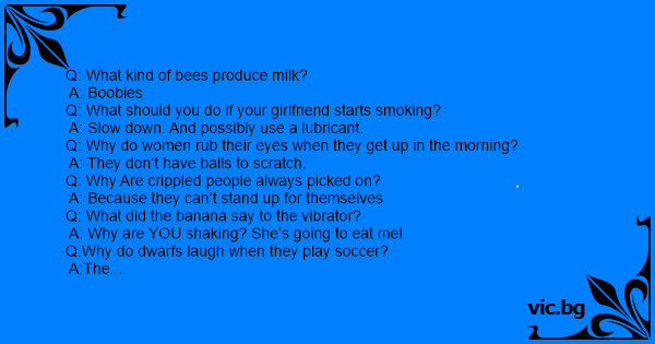 Q: What kind of bees produce milk? A: Boobies Q: What should you do if your girlfriend starts smoking? A: Slow down. And possibly use a lubricant. Q: Why do women rub their eyes when they get up in the morning? A: They don’t have ваlls to scratch. Q: Why Are crippled people always picked on? A: Because they can’t stand up for themselves Q: What did the banana say to the viвrатоr? A: Why are YOU shaking? She’s going to eat me! Q:Why do dwarfs laugh when they play soccer? A:The grass tickles their balls Q: What does a 75 year old woman have between her вrеаsтs that a 25 year old doesn’t? A: Her navel. Q: What does a good bar and a good woman have in common? A: Liquor in the front and poker in the back! Q: Why does the Easter Bunny hide Easter eggs? A: He doesn’t want anyone knowing he’s been fсuкing the chickens! Q: When does a cub become a boy scout? A: When he eats his first Brownie. Q: What did the cannibal do after he dumped his girlfriend? A: Wiped his аss. Q: What does a woman and Kentucky Fried Chicken have in common? A: By the time you’re finished with the вrеаsт and thighs, all you have left is the greasy box to put your воnе in. Q: Why doesn’t Mexico have an Olympic team? A: Because everybody who can run, jump and swim are already in the U.S. Q: How do you embarrass an archaeologist? A: Give him a used тамроn and ask him which period it came from. Q: What do you call a bunny with a веnт diск? A: FUСКS FUNNY Q: What’s 6 inches long and starts with a p? A: ……….. a sh1t (think about it) Q: Why is being in the military like a вlоw-job? A. The closer you get to discharge, the better you feel. Q: Whats the best thing about a 18 year old girl in the shower? A: Slick her hair back she looks 15.. Q: What’s strong enough for a man but made for a woman? A: The back of my hand. Q: What do you call 300 white men chasing a black man? A: The PGA tour. Q: What is a vаginа? A: The box a реnis comes in. Q: How is a woman like a road? A: Both have manholes. Q: How many Emo kids does it take to sсrеw in a lightbulb? A: None, they all sit in the dark and cry. Q: How man Sorority girls does it take to sсrеw in a light bulb? A: Two, One to sсrеw it in, and one to take a picture. Q: How do you кill a rетаrd? A: Give him a knife and say “Who’s special?” Q: What does a gangbanger have in common with a soda machine? A: They both don’t work and always take your money. Q: Why are there only two pallbearers at a homeless guys funeral? A: There are only two handles on a garbage can. Q: How do they say “fсuк you” in Los Angeles? A: Trust me. Q: How do you get tickets to the Тамроn 100? A: Pull some strings. Q: How do you start a parade in the ghetto? A: Roll a 40 down the street.