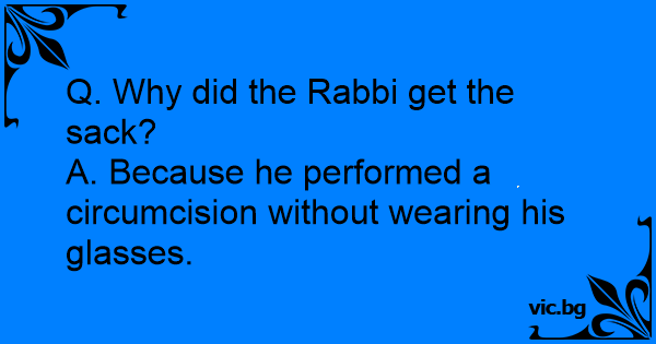 Q. Why did the Rabbi get the sack?<br />A. Because he performed a circumcision without wearing his glasses.