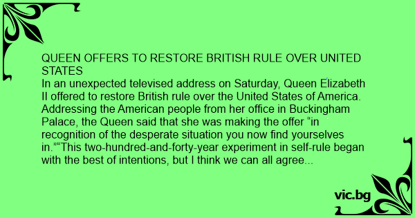 In an unexpected televised address on Saturday, Queen Elizabeth II offered to restore British rule over the United States of America. Addressing the American people from her office in Buckingham Palace, the Queen said that she was making the offer “in recognition of the desperate situation you now find yourselves in.”“This two-hundred-and-forty-year experiment in self-rule began with the best of intentions, but I think we can all agree that it didn’t end well,” she said. The Queen urged Americans to write in her name on Election Day, after which the transition to British rule could begin “with a minimum of bother.”Elizabeth acknowledged that, in the wake of Brexit, Americans might justifiably be alarmed about being governed by the British parliamentary system, but she reassured them, “Parliament would play no role in this deal. This would be an old-school monarchy. Just me, and then, assuming you’d rather not have Charles, we could go straight to William and those children of his who have mesmerized you so.”Using the closing moments of her speech to tout her credentials, the Queen made it clear that she has never used e-mail and has only had sеx with one person “very occasionally.”Just in - The Above is Fake News - Following is the actual full text