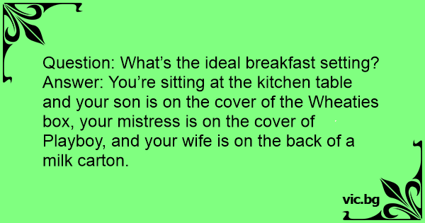 Answer: You’re sitting at the kitchen table and your son is on the cover of the Wheaties box, your mistress is on the cover of Рlаyвоy, and your wife is on the back of a milk carton.