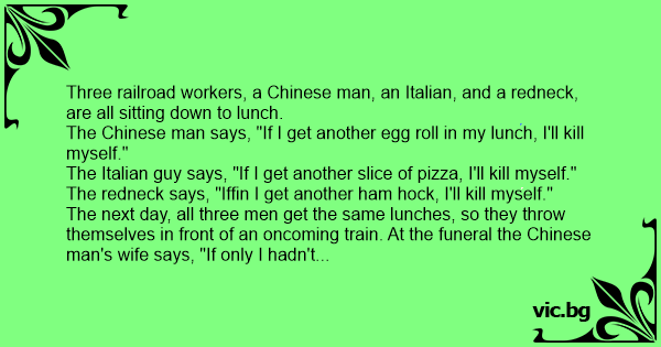 The next day, all three men get the same lunches, so they throw themselves in front of an oncoming train. At the funeral the Chinese man's wife says, "If only I hadn't packed an egg roll that day."
