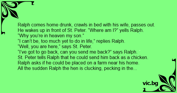 So Ralph the hen lays an egg, felt absolutely wonderful, lays another, felt even better. Right in the middle of laying his third egg; Ralph the hen feels a rap on the back of his head.