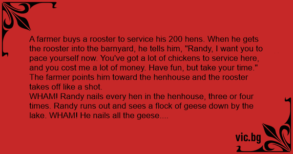 A farmer buys a rooster to service his 200 hens. When he gets the rooster into the barnyard, he tells him, "Rаndy, I want you to pace yourself now. You've got a lot of chickens to service here, and you cost me a lot of money. Have fun, but take your time."