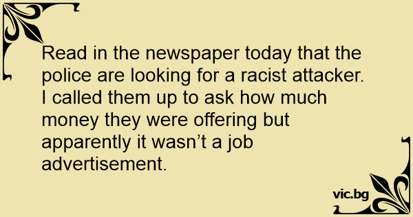Read in the newspaper today that the police are looking for a racist attacker. I called them up to ask how much money they were offering but apparently it wasn’t a job advertisement.