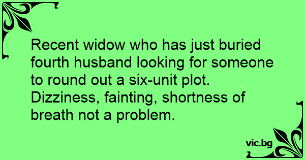 Recent widow who has just buried fourth husband looking for someone to round out a six-unit plot.