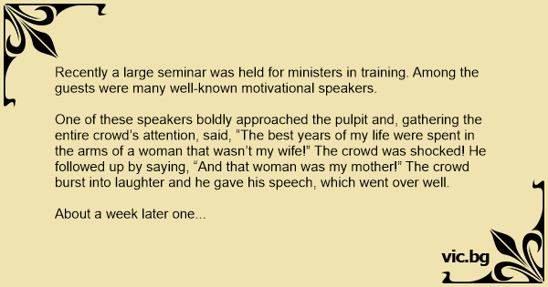 One of these speakers boldly approached the pulpit and, gathering the entire crowd’s attention, said, “The best years of my life were spent in the arms of a woman that wasn’t my wife!” The crowd was shocked! He followed up by saying, “And that woman was my mother!” The crowd burst into laughter and he gave his speech, which went over well.