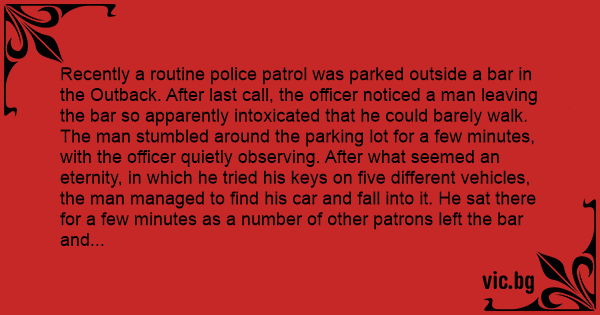 Recently a routine police patrol was parked outside a bar in the Outback. After last call, the officer noticed a man leaving the bar so apparently intoxicated that he could barely walk.