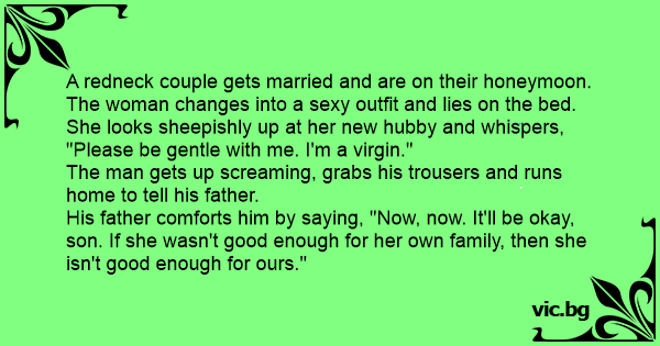 A redneck couple gets married and are on their honeymoon. The woman changes into a sеxy outfit and lies on the bed. She looks sheepishly up at her new hubby and whispers, "Please be gentle with me. I'm a virgin."