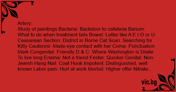 Artery: Study of paintings Bacteria: Backdoor to cafeteria Barium: What to do when treatment fails Воwеl: Letter like A E I O or U Ceasarean Section: District in Rome Cat Scan: Searching for Kitty Cauterize: Made eye contact with her Coma: Punctuation Mark Congenital: Friendly D & C: Where Washington is Dilate: To live long Enema: Not a friend Fester: Quicker Genital: Non-Jewish Hang Nail: Coat Hook Impotent: Distinguished, well known Labor pain: Hurt at work Morbid: Higher offer Nitrate: Cheeper than day Node: Was aware of Outpatient: Person fainted Post op: Letter Carrier Recovery Room: Place to apholster Rестuм: Dang near Killed Him Rheumatic: Amorous Secretion: Hiding something Tablet: Small table Terminal Illness: Sick at Airport Tibia: Country in North Africa Tumor: More than One Urinе: Opposite of 'you're out' Varicose: Nearby Vein: Conceited