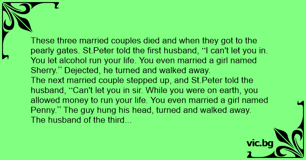 The next married couple stepped up, and St.Peter told the husband, Can't let you in sir. While you were on earth, you allowed money to run your life. You even married a girl named Penny. The guy hung his head, turned and walked away.