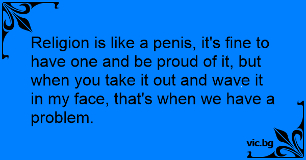 Скъпи мой, религията е като пeниc. Напълно нормално е човек да има такъв и дори да се гордее с него, но когато го извади и започне да ми го размахва пред лицето — тогава вече имаме проблем.