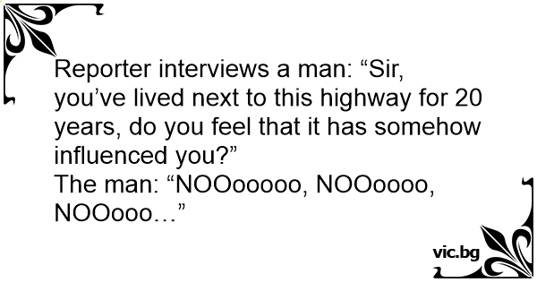 Reporter interviews a man: “Sir, you’ve lived next to this highway for 20 years, do you feel that it has somehow influenced you?”