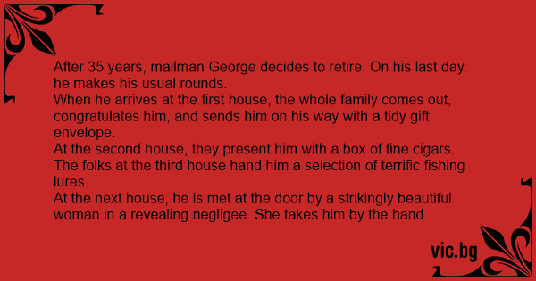 Finally, it was Ned the Mailman’s last day. As he did his final rounds, he reached the door of the first house and was greeted by a elderly couple who gave him a gift certificate. At the next...